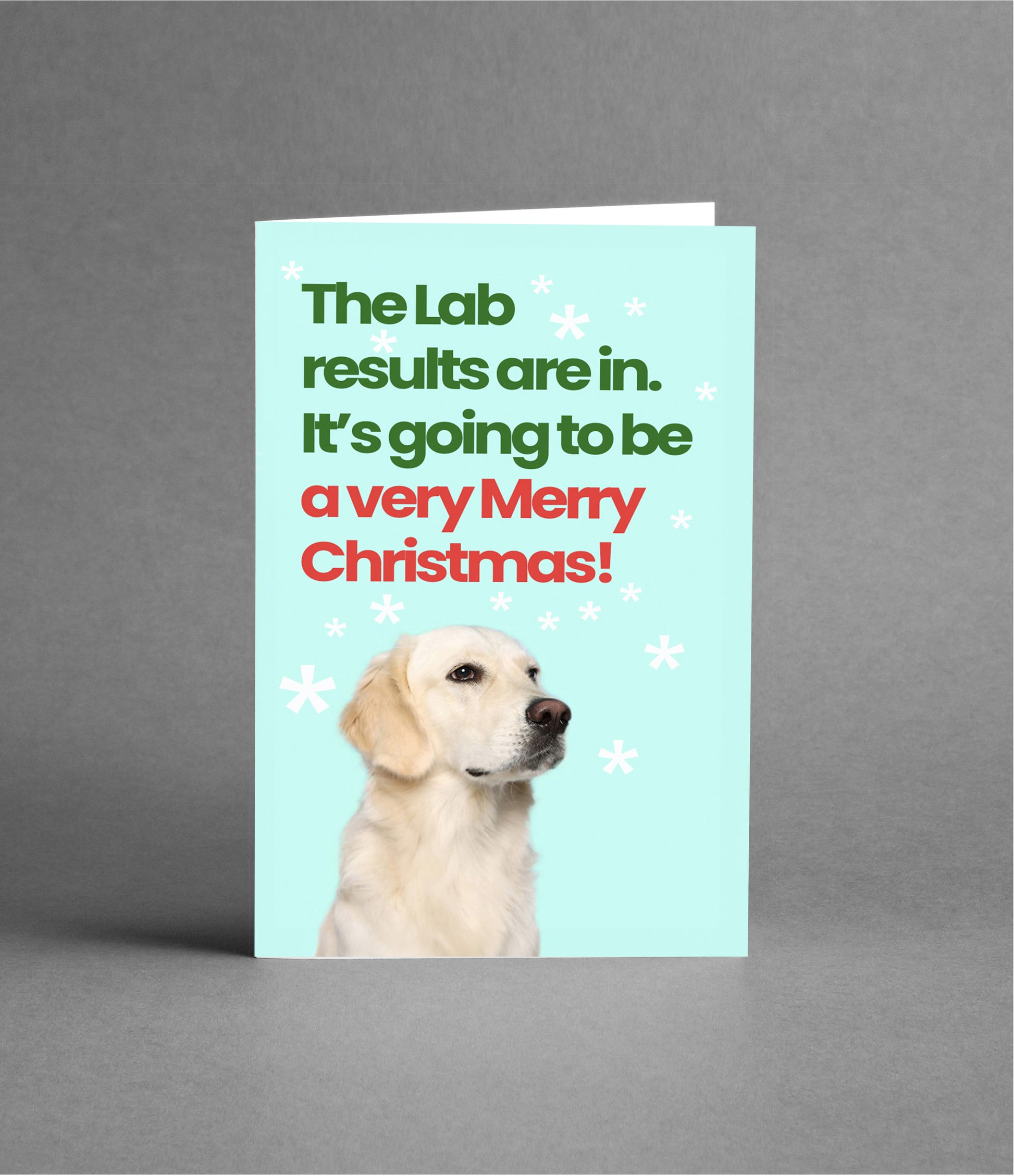 The Lab is pictured on a pastel background, staring intelligently into the distance. This card is scientifically proven to improve any Christmas.