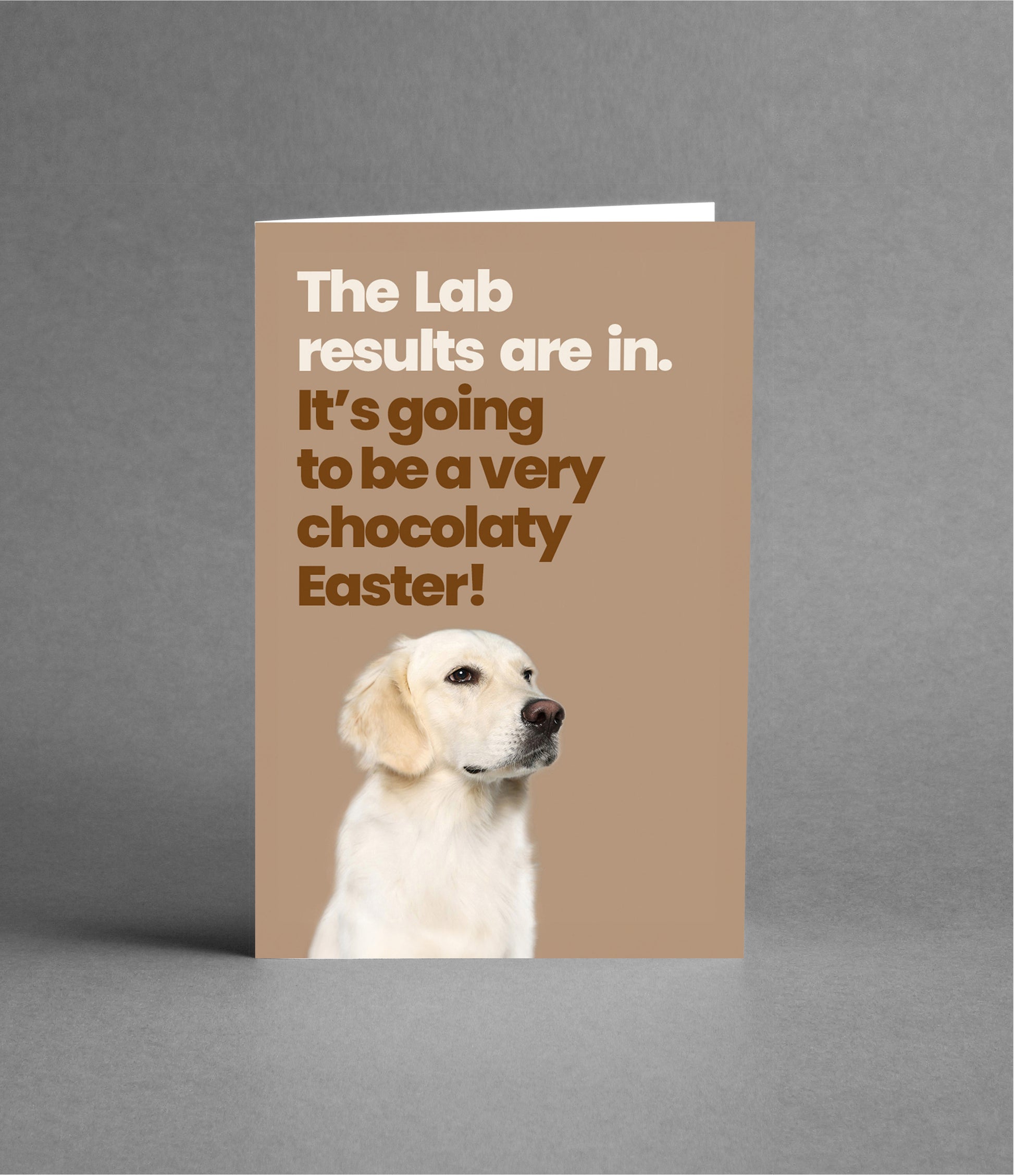 The Lab is pictured on a cocoa coloured, pastel background, staring thoughtfully into the distance. This card is scientifically proven to improve any Easter.