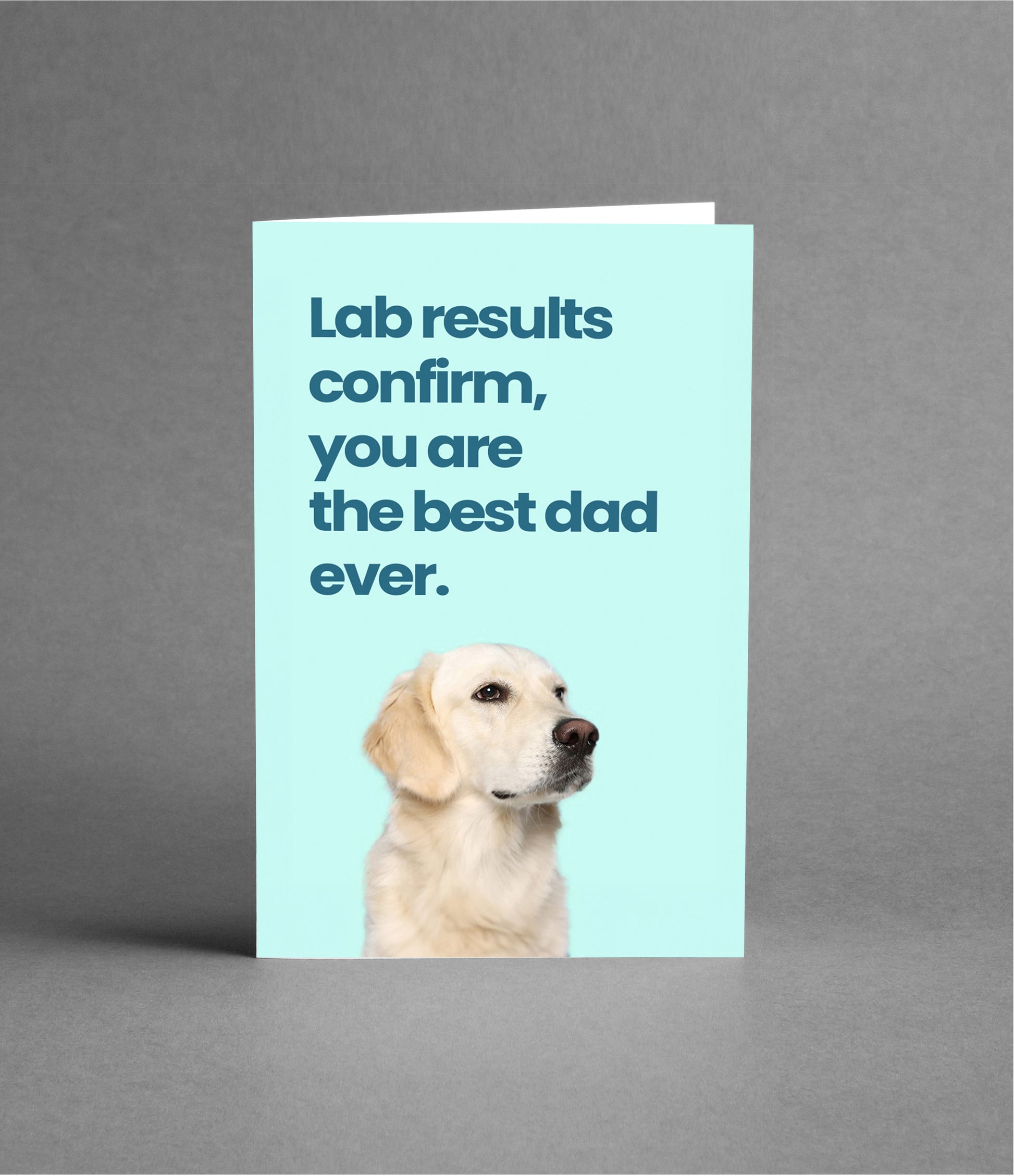 The Lab is pictured on a pastel green background, staring thoughtfully into the distance. This card is scientifically proven to satisfy every, single variety of father in the universe.