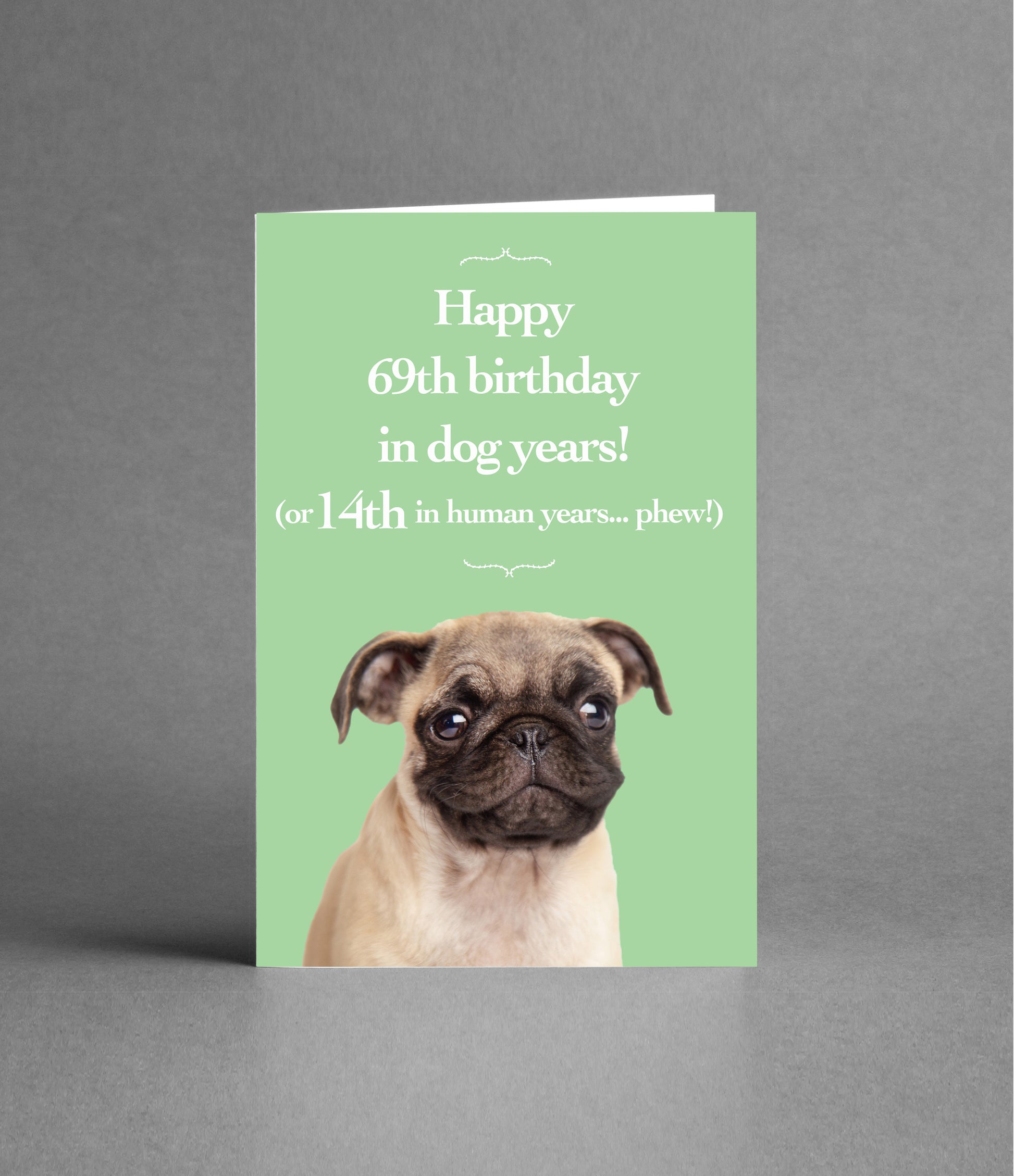 Our cheeky Pug, Eric, posing against a pastel green studio background.
