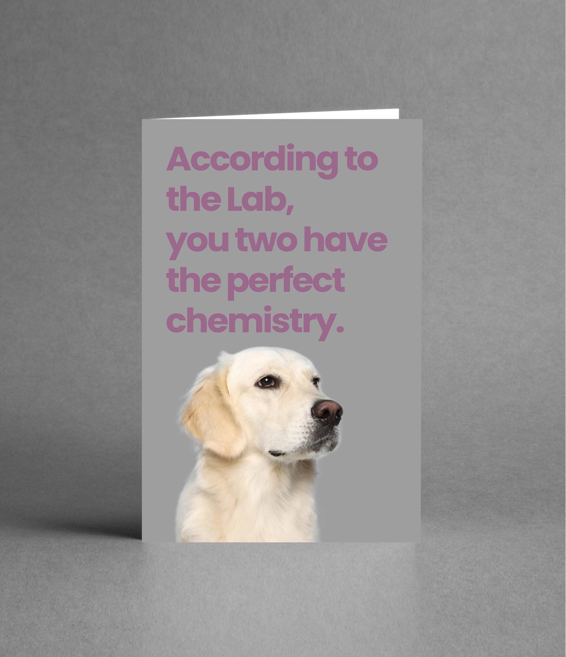 The Lab is pictured on a pale grey background, staring intelligently into the distance. According to The Lab, this card is scientifically proven to improve even the most perfect relationships.